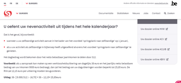 Dit is het voorbeeld die men op de site van de rva geeft. In dit eerste voorbeeld gaat men ervan uit dat je een volledig jaar van dit systeem geniet terwijl je een zelfstandige activiteit uitvoert.