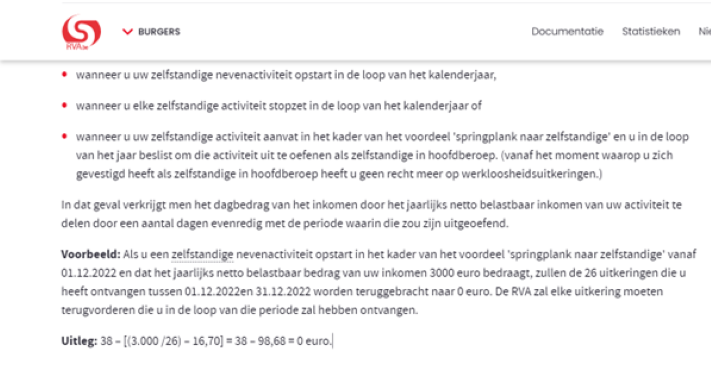 Dit is het voorbeeld die men op de site van de rva geeft. In dit voorbeeld gaat men ervan uit dat je 1 maand van dit systeem geniet terwijl je een zelfstandige activiteit uitvoert. De uitkomst is hier niet 0 euro, maar wordt naar 0 herleidt.